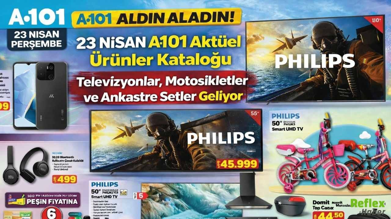 A101’in 23 Nisan 2026 Perşembe günü mağazalara gelecek aktüel ürün listesi açıklandı. Katalogda evini yenilemek isteyenler için televizyon seçenekleri, beyaz eşya grubu ve mutfak ürünleri öne çıkıyor. Kampanya kapsamında 65 inç 4K UHD Smart TV, 55 inç 4K UHD Smart TV ve 50 inç QLED TV gibi modeller raflarda yer alacak. Ulaşım ürünleri tarafında benzinli motosiklet ve moped seçenekleri listede bulunuyor. Mutfak düzeni için turbo cam ankastre set 9.999 TL etiketiyle duyuruldu. 23 Nisan Ulusal Egemenlik Ve Çocuk Bayramı kapsamında oyuncak, bisiklet ve spor ürünleri de reyonlara geliyor. Satışların stoklarla sınırlı olacağı hatırlatılırken, fiyatların mağazaya ve tedarik durumuna göre değişebileceği bilgisi paylaşılıyor.