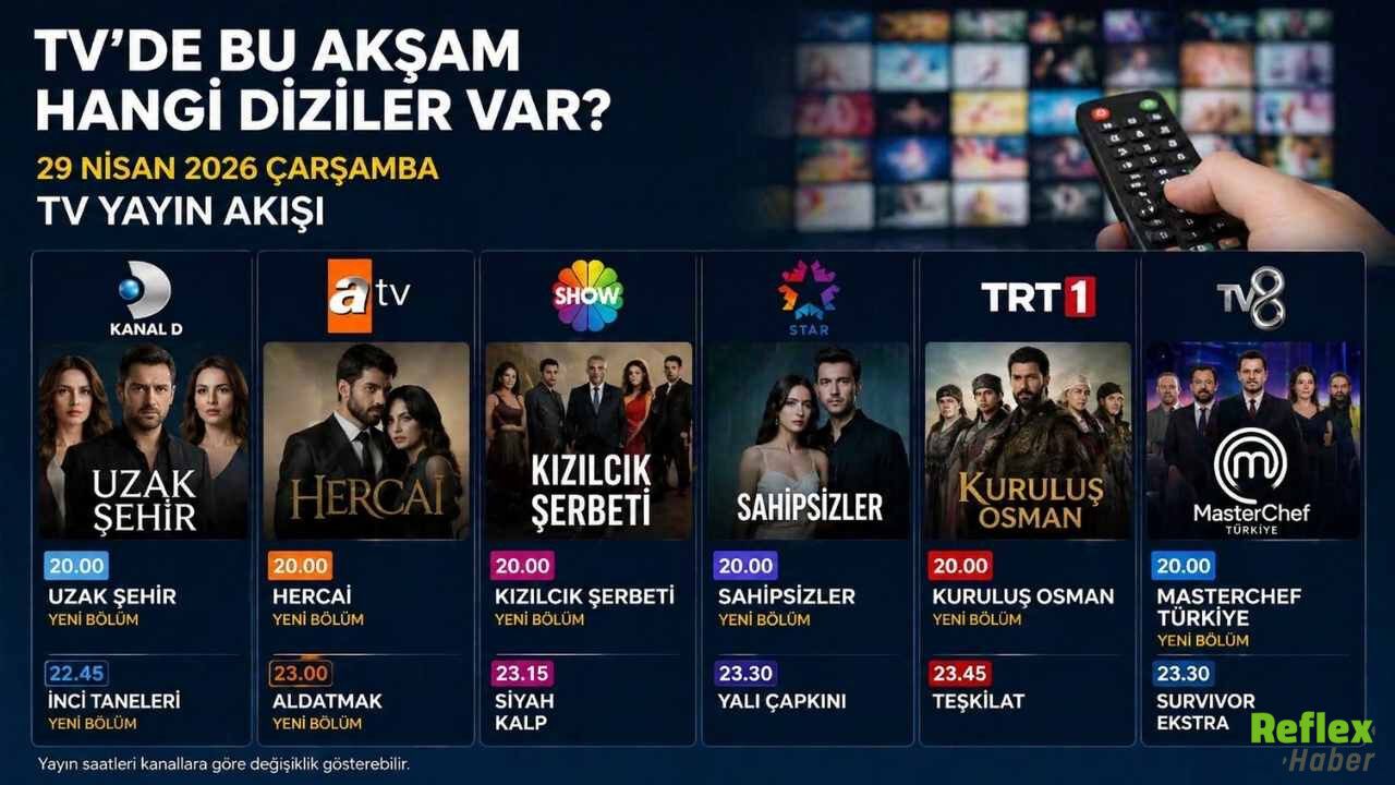 29 Nisan 2026 Çarşamba günü televizyon ekranlarında izleyicileri yoğun bir program bekliyor. Günün yorgunluğunu dizi, film ya da yarışma programı izleyerek atmak isteyenler için ulusal kanalların yayın akışı netleşti. Bu akşam saat 20.00 kuşağında birçok yapım aynı anda ekrana gelecek. Diziler ve eğlence programlarının yanı sıra futbolseverler için de önemli bir karşılaşma var. UEFA Şampiyonlar Ligi yarı final mücadelesinde Atletico Madrid ile Arsenal karşı karşıya gelecek. İşte Kanal D, ATV, TRT 1, Show TV, TV8 ve Star TV yayın akışı detayları.