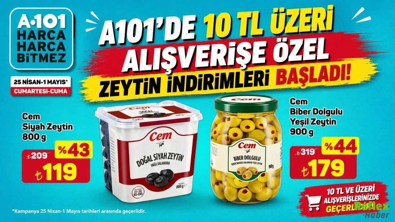 A101 market zinciri, 25 Nisan ile 1 Mayıs tarihleri arasında geçerli olacak yeni bir kampanyayı duyurdu. Kampanya kapsamında, 10 TL ve üzeri alışveriş yapan müşterilere özel olarak zeytin ürünlerinde indirim fırsatı sunuluyor.