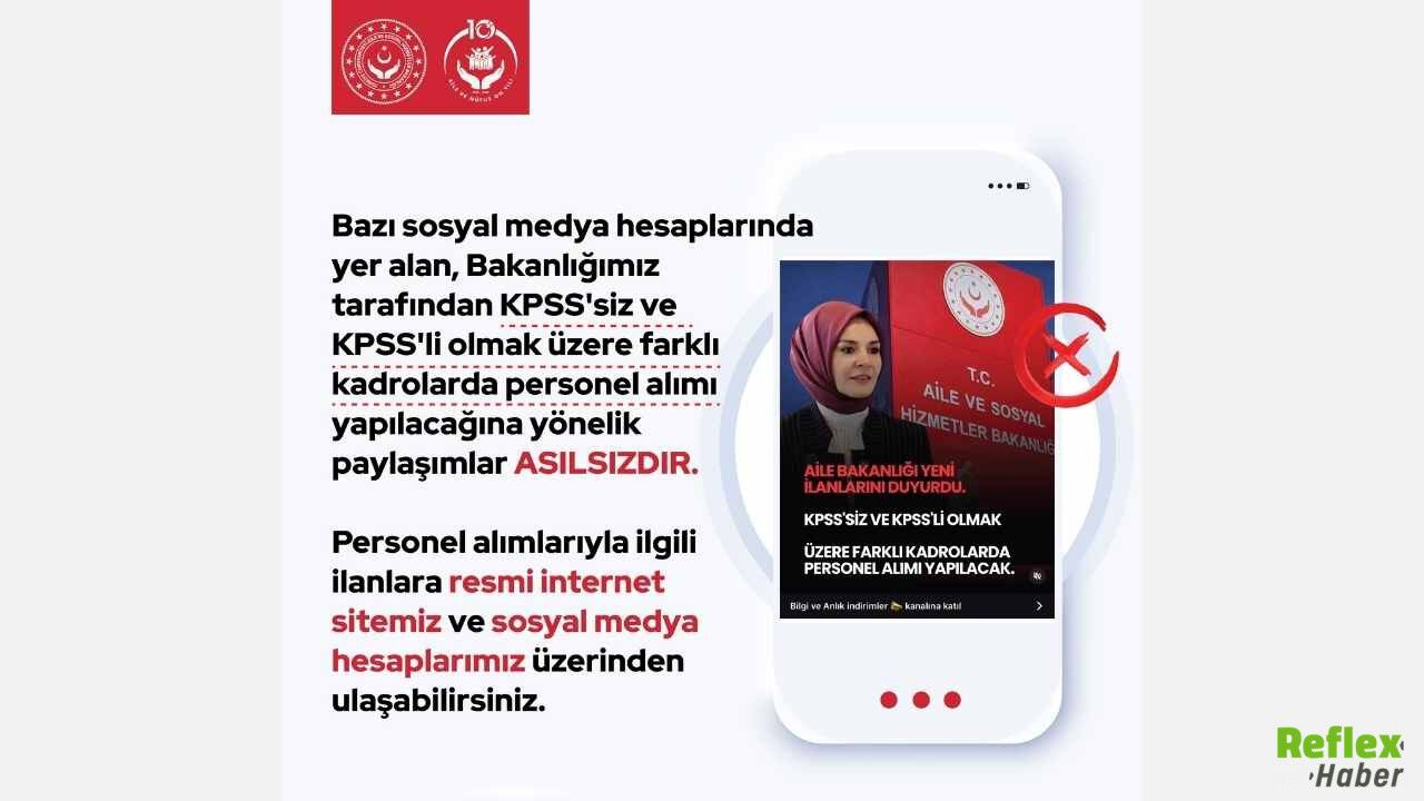 Aile ve Sosyal Hizmetler Bakanlığı, sosyal medyada yayılan personel alımı iddialarına ilişkin açıklama yaptı. Bakanlık, KPSS’li ve KPSS’siz olmak üzere farklı kadrolarda alım yapılacağı yönündeki paylaşımların gerçeği yansıtmadığını duyurdu. Son günlerde çeşitli sosyal medya hesaplarında yer alan ilanların ardından yapılan resmi açıklamada, söz konusu içeriklerin asılsız olduğu belirtildi. Bakanlık, vatandaşların yalnızca resmi kanallar üzerinden yapılan duyuruları dikkate alması gerektiğini vurguladı.