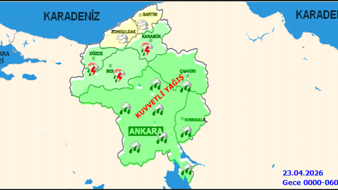 Ankara'da bugün (23 Nisan Perşembe) parçalı ve çok bulutlu bir hava hakim olacak. Gün boyunca aralıklı sağanak ve yer yer gök gürültülü sağanak yağışların etkili olması bekleniyor. Özellikle öğle saatlerine kadar yerel olarak kuvvetli yağış geçişleri görülebilir.