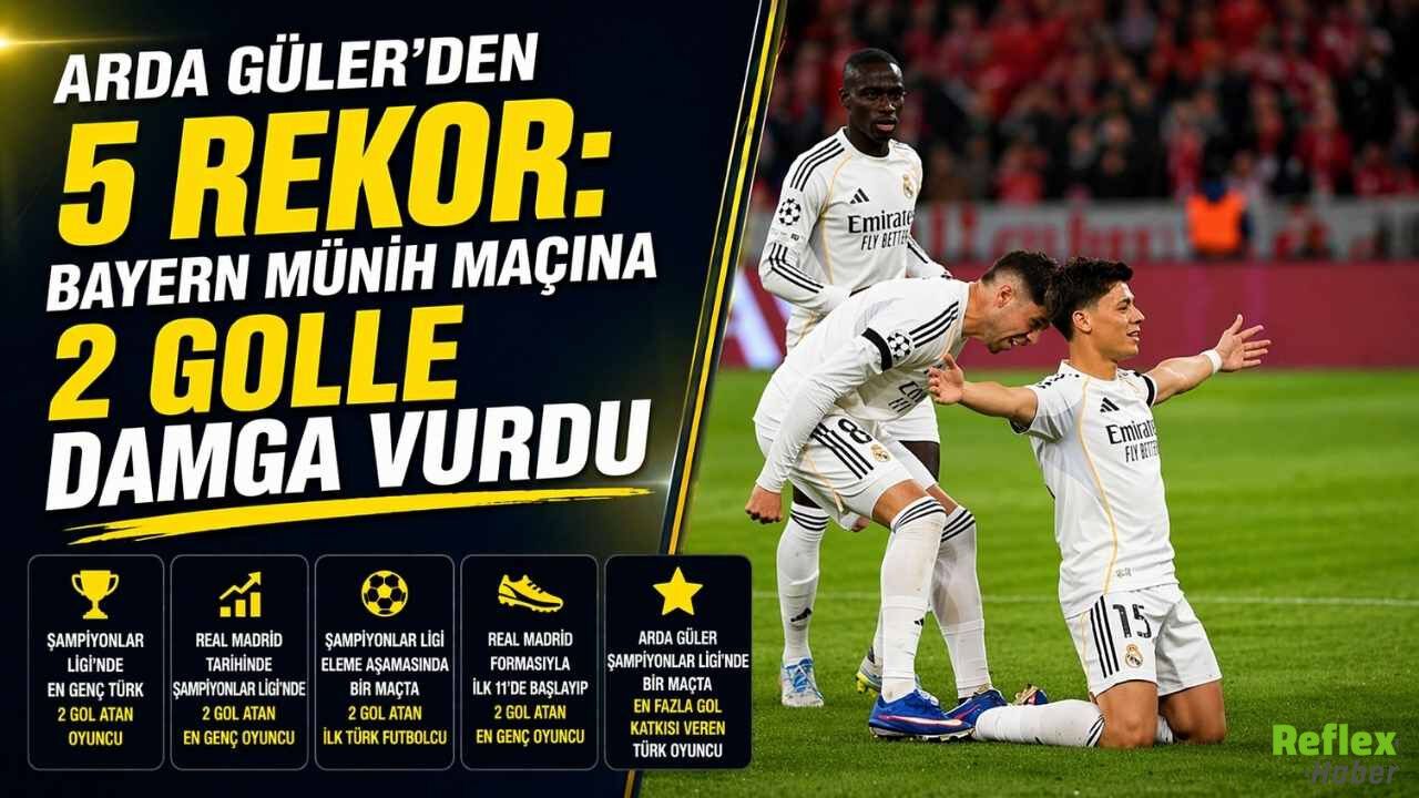 Arda Güler, UEFA Şampiyonlar Ligi çeyrek final rövanşında Bayern Münih karşısında attığı 2 golle gecenin en çok konuşulan ismi oldu. Real Madrid deplasmanda 4-3 kaybedip turnuvaya veda etse de, milli futbolcu ortaya koyduğu performansla kulüp ve turnuva tarihine geçen istatistiklere imza attı. Reuters ve UEFA kayıtlarına göre Arda Güler, Allianz Arena’daki maçta 35. saniyede ağları havalandırdı, ardından 29. dakikada frikikten gol buldu. Karşılaşma sonunda Bayern Münih yarı finale yükselirken, Arda Güler’in adı 5 ayrı rekorla öne çıktı.