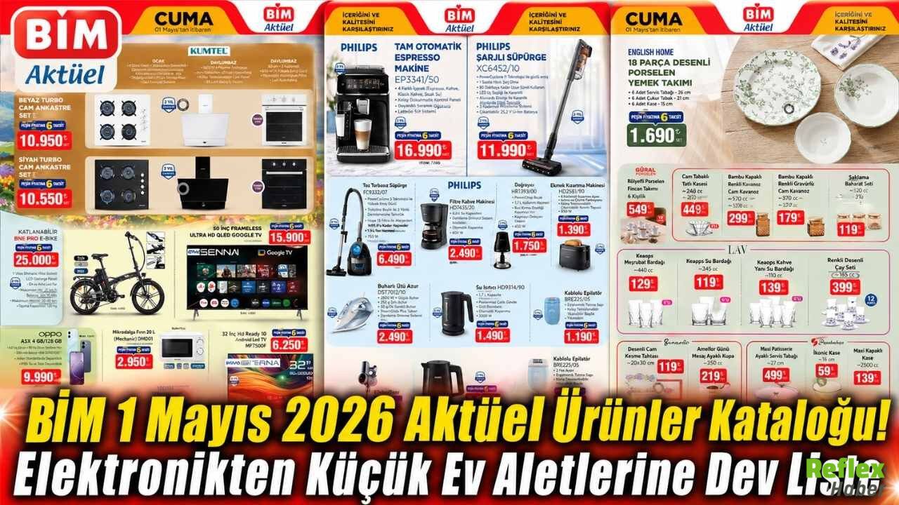 1 Mayıs 2026 Cuma günü BİM raflarında yer alacak aktüel ürünler belli oldu. Elektronik ürünlerden küçük ev aletlerine, mutfak gereçlerinden kişisel bakım ürünlerine kadar geniş bir ürün yelpazesi dikkat çekiyor. Özellikle televizyon, akıllı telefon, espresso makinesi ve elektrikli bisiklet gibi yüksek fiyatlı ürünler katalogda öne çıkarken, uygun fiyatlı mutfak ekipmanları ve ev aksesuarları da listede yer alıyor. Anneler Günü öncesine denk gelen katalogda hediye alternatifleri de bulunuyor. Teknoloji ve beyaz eşya grubundaki ürünler sınırlı stokla satışa sunulacak. İşte 1 Mayıs 2026 BİM aktüel kataloğunda öne çıkan ürünler ve fiyatları.