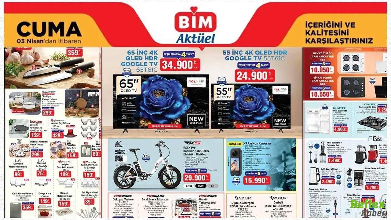 BİM 3 Nisan kataloğunda teknoloji ürünleri ilk sırada yer aldı. TCL markalı 65 inç televizyon 34.900 TL, 55 inç televizyon ise 24.900 TL fiyatla satışa sunuluyor. Ayrıca RKS markalı katlanır elektrikli bisiklet 29.900 TL fiyatıyla katalogda dikkat çeken ürünlerden biri oldu.