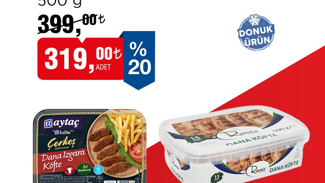 Kampanya kapsamında, Aytaç markalı dana köfte 500 gramlık paketlerde %20 indirimle sunuluyor. Normalde 399 TL olan ürün, indirimle 319 TL'ye düşüyor. Ayrıca Ramiz Dana Köfte de 500 gramlık paketlerde satışa sunuluyor.