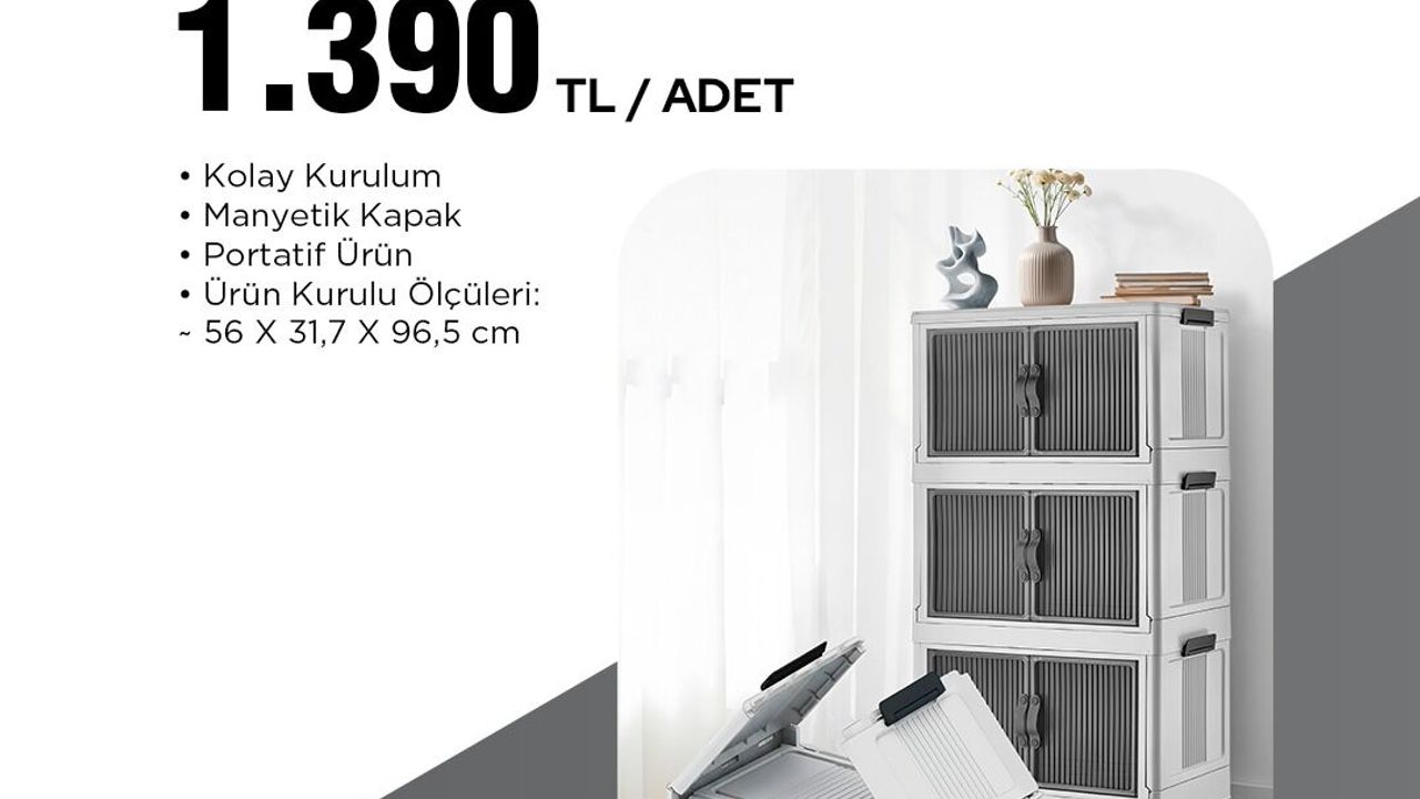 Görselde yer alan bilgilere göre, DECOLIVE markalı 3'lü katlanır dolap, 1.390 TL'den satışa sunulacak. Ürün, kolay kurulumu, manyetik kapağı ve portatif yapısıyla öne çıkıyor. Kurulum sonrası 56 x 31,7 x 96,5 cm ölçülerine sahip olan dolaptan stoklarda 7.000 adet bulunacak.