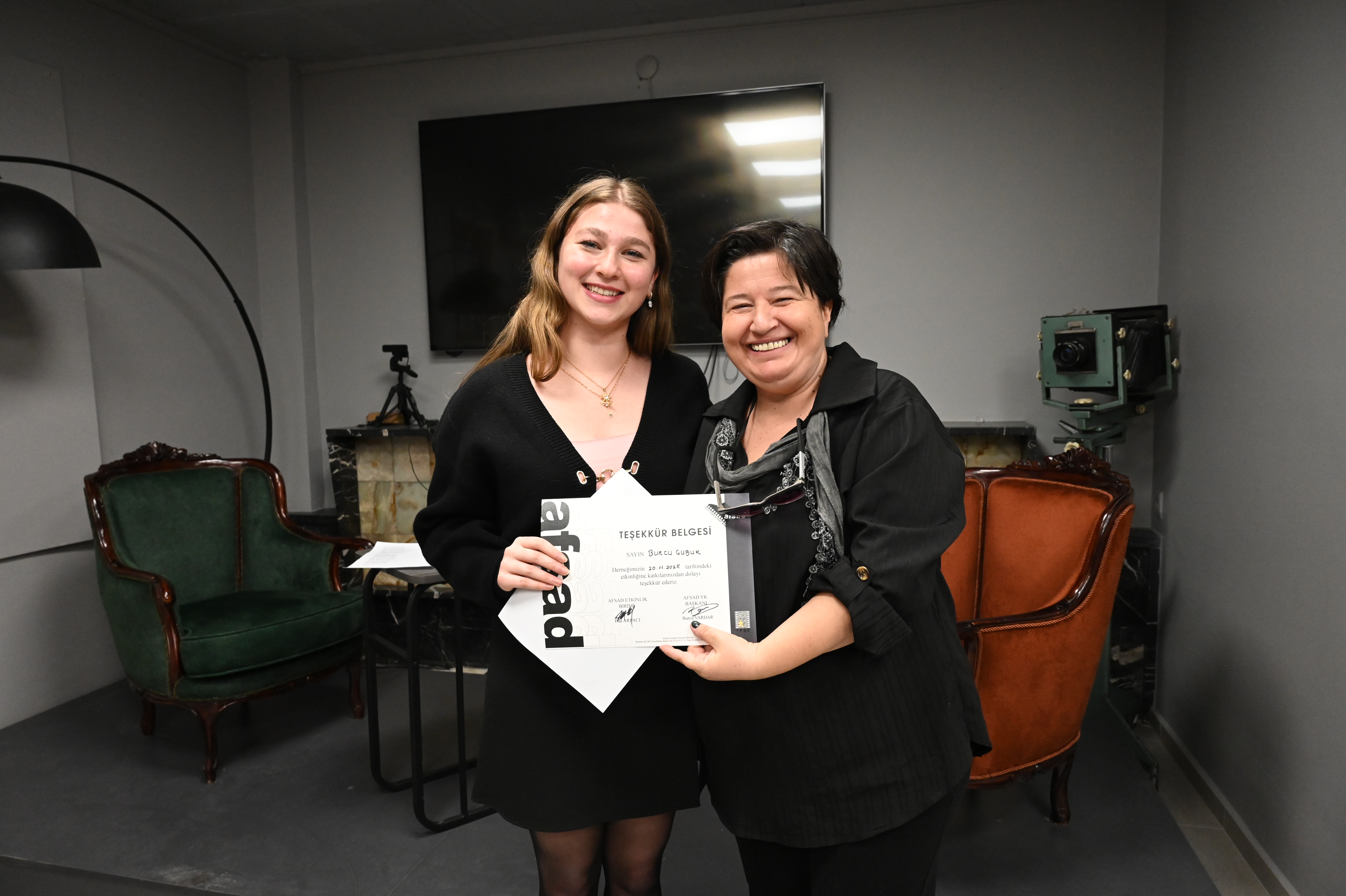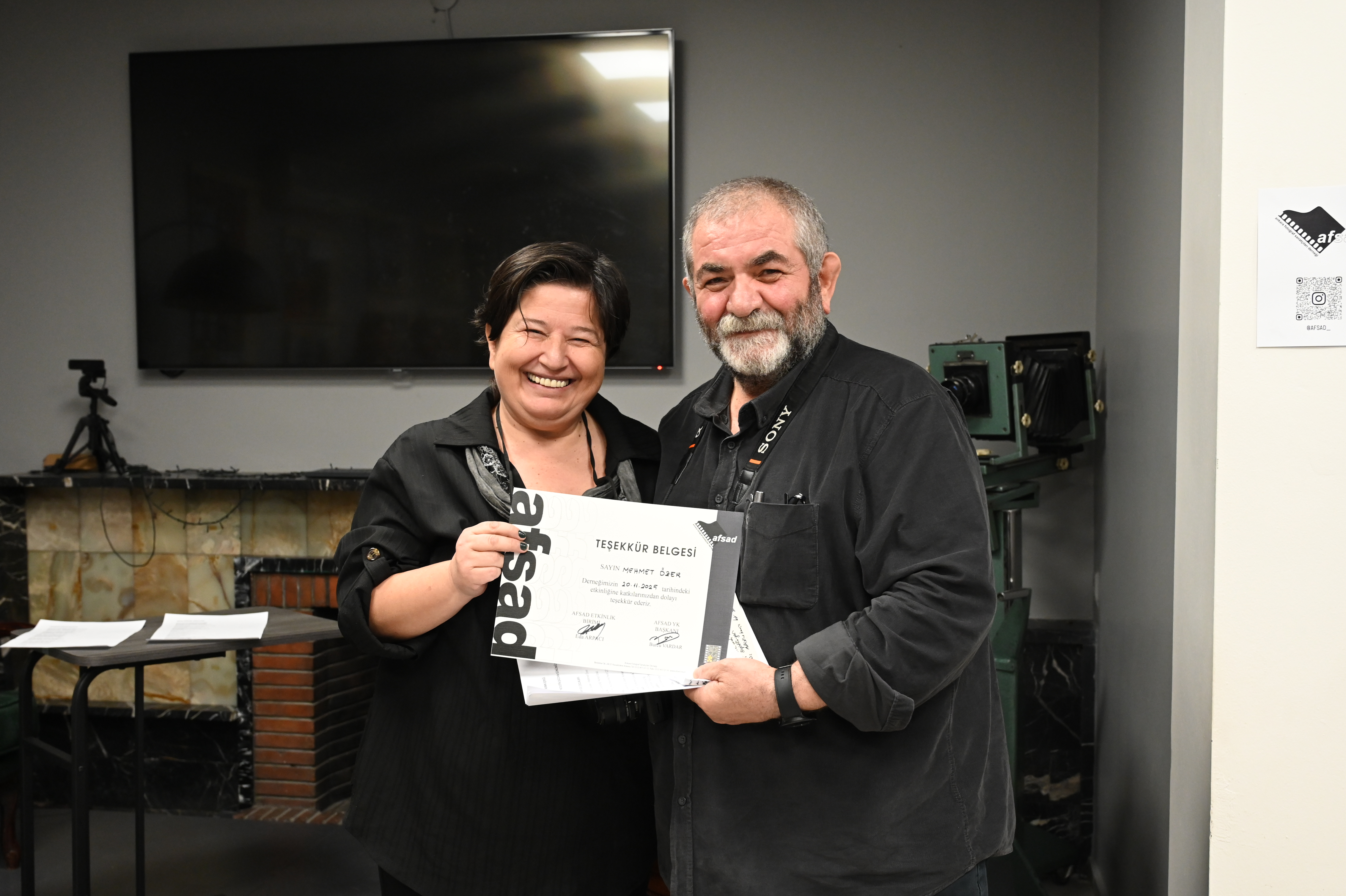 Etkinliğin sonunda AFSAD Başkanı Burcu Vardar Atölye yürütücüsü Mehmet Özer ve Atölye Çocuk Danışma Kurulu üyesi Burcu Çubuk'a teşekkür belgelerini takdim ederek, Toplumcu Gerçekçi Belgesel Fotoğraf Atölyesi'ne katkı sunan tüm sanatçılara teşekkür etti.