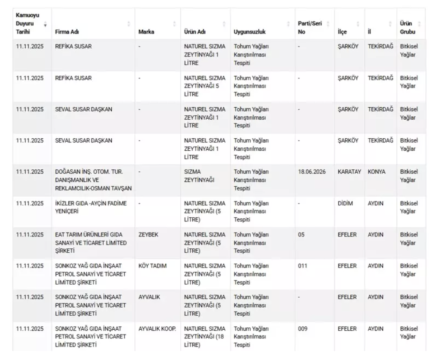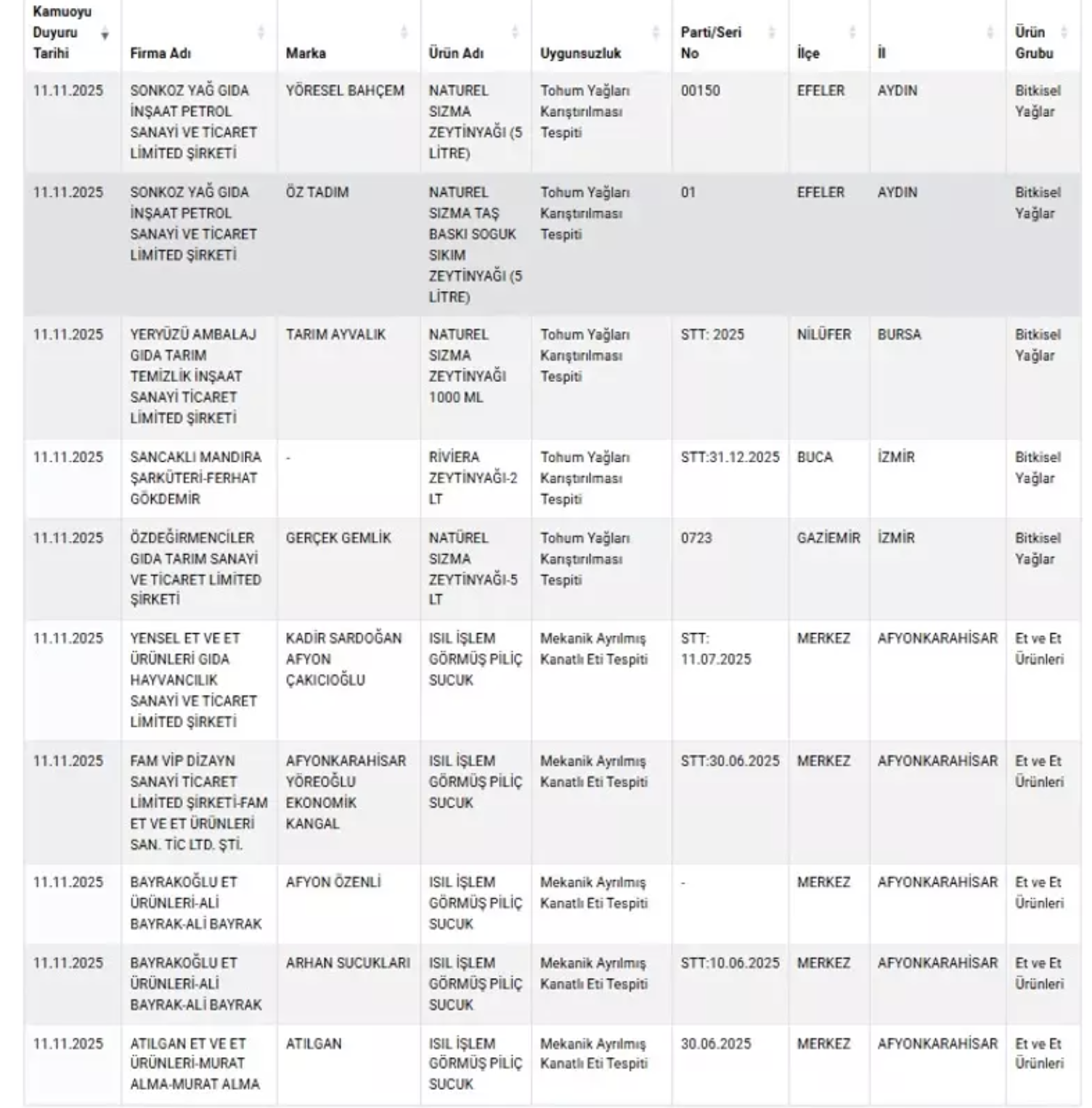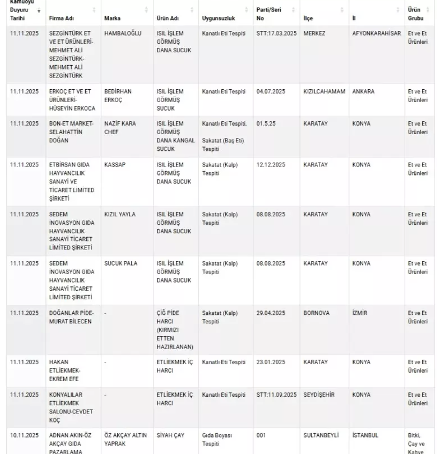 Testler sonucunda bazı dana sucuklarda tek tırnaklı et ve sakatat kullanımı, yağ ürünlerinde ise çeşitli usulsüzlükler olduğu belirlendi. Bakanlık, bu ürünlerin tüketicilere zarar verebileceğini ve halk sağlığını tehdit edebileceğini açıkladı.