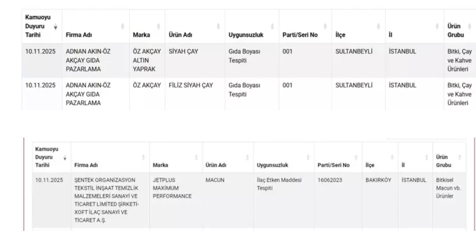 Bakanlığın denetimlerinde bazı markaların 'siyah çay' adıyla sattığı ürünlerde gıda boyası tespit edildi. Macun ürünlerinde ise ilaç etken maddesi bulundu. Uzmanlar, özellikle çocuklar ve hassas gruplar için bu tür ürünlerin risk taşıdığına dikkat çekiyor.