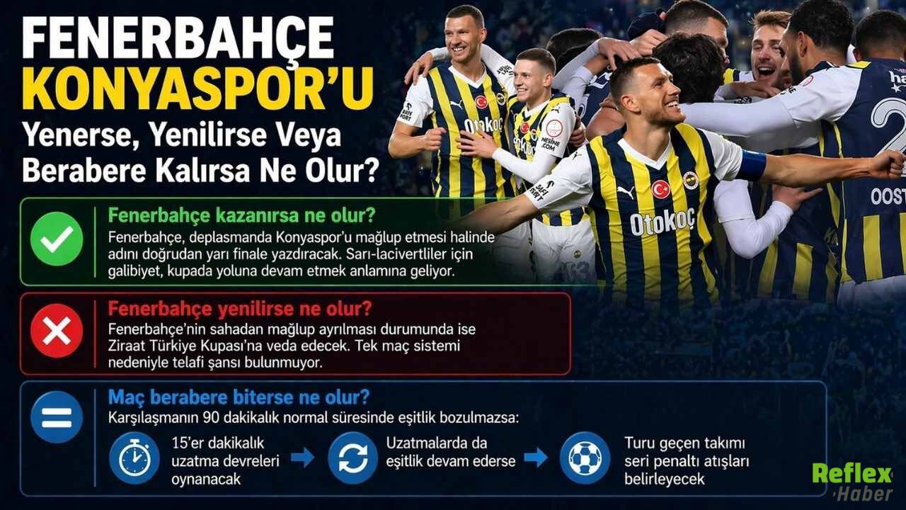Ziraat Türkiye Kupası çeyrek finalinde TÜMOSAN Konyaspor ile Fenerbahçe, Konya’da tek maç eleme sistemiyle sahaya çıkacak. Bu formatta 90 dakika sonunda turu geçen ekip netleşiyor; skor eşitliği bozulmazsa uzatma dakikaları oynanıyor, uzatmada da denge devam ederse tur penaltı atışlarıyla belirleniyor. Karşılaşma öncesi en çok merak edilen başlık ise maçın olası sonuçlarının kupadaki karşılığının ne olacağı. Galibiyet, mağlubiyet ya da beraberlik ihtimallerinin her biri kupada doğrudan tur tablosunu etkiliyor. TFF statüsünde eleme ve final aşamalarının tek maç üzerinden oynandığı, eşitlik halinde uzatma ve penaltı prosedürünün uygulandığı bilgisi yer alıyor.