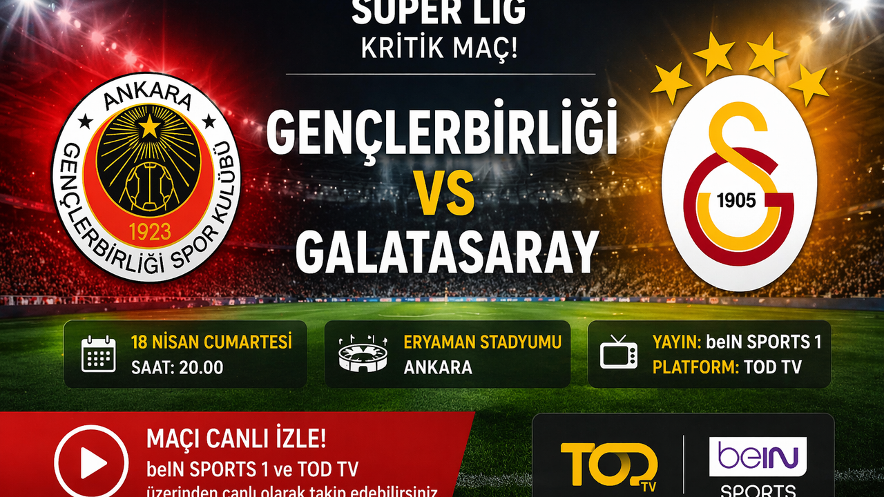 Gençlerbirliği ile Galatasaray arasında oynanacak Süper Lig karşılaşmasının yayın bilgileri netleşti. Mücadele 18 Nisan Cumartesi günü saat 20.00’de başlayacak. Ankara’daki Eryaman Stadyumu karşılaşmaya ev sahipliği yapacak. Maç, beIN Sports 1 ekranlarından canlı yayınlanacak.