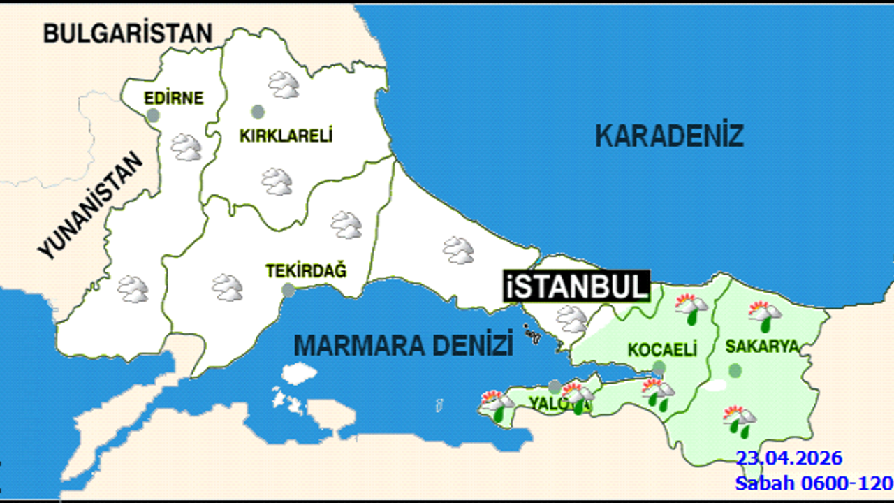 Genel meteorolojik görünümde, bölgenin doğusundaki Kocaeli, Sakarya ve Yalova çevreleri ile bu akşam Edirne'nin bazı bölgelerinde aralıklı sağanak yağışlar öngörülüyor. Hava sıcaklıklarının şu anda mevsim normallerinin altında seyrettiği, ancak yarından itibaren 4 ila 6 derece artarak mevsim normalleri civarına ulaşmasının beklendiği belirtildi. Rüzgarın ise doğu ve kuzeydoğu yönlerden (Poyraz) orta kuvvette, zaman zaman 30-50 km/saat hızla esmesi öngörülüyor.