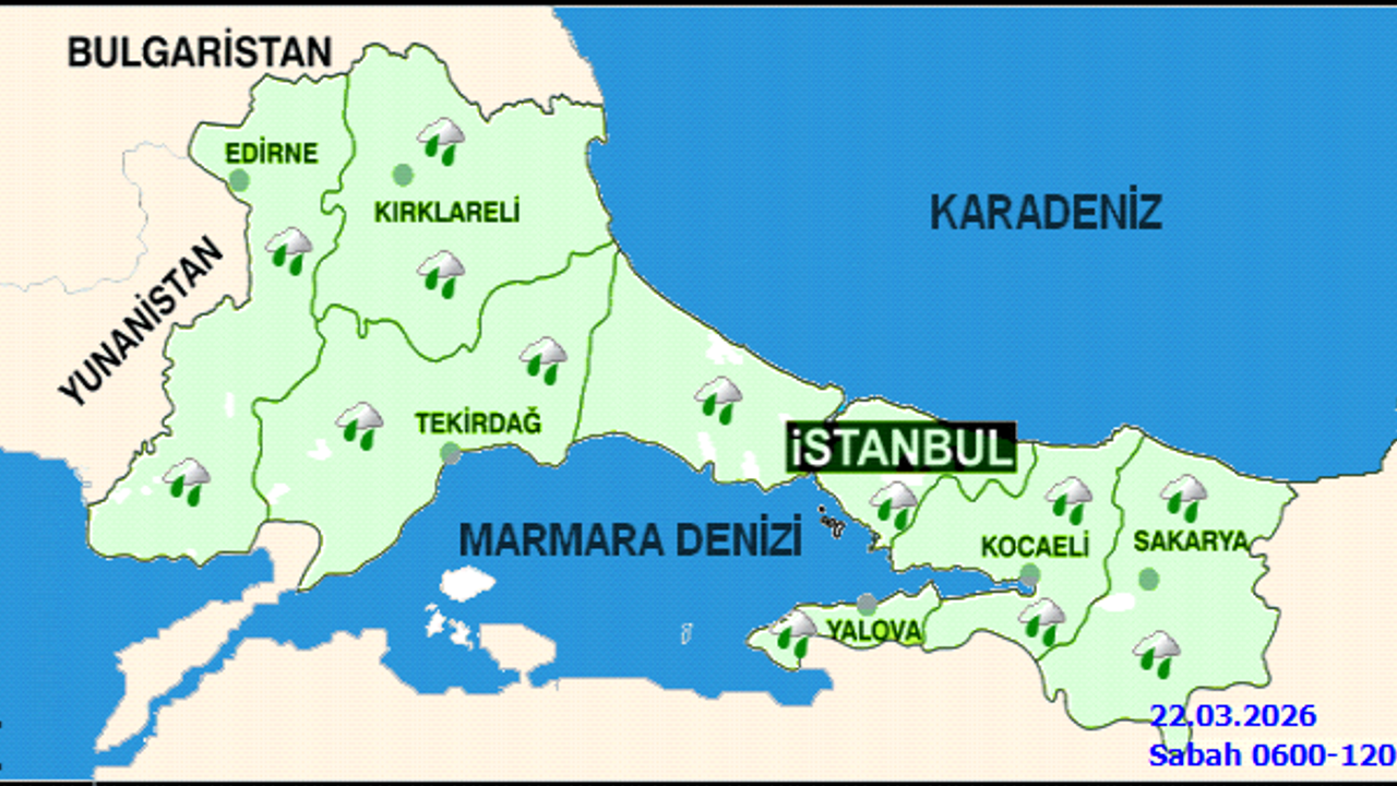İstanbul'da bugün (22 Mart Pazar) parçalı bulutlu ve aralıklı yağmur geçişlerinin yaşanması bekleniyor. En düşük sıcaklığın 7°C, en yüksek sıcaklığın ise 11°C olması öngörülüyor. Gece ve sabah saatlerinde yer yer pus ve sis görülebileceği, hava sıcaklıklarının mevsim normallerinin altında seyredeceği tahmin ediliyor. Rüzgarın kuzey ve kuzeydoğu yönlerden orta kuvvette, zaman zaman 30-50 km/sa hızla esmesi bekleniyor.