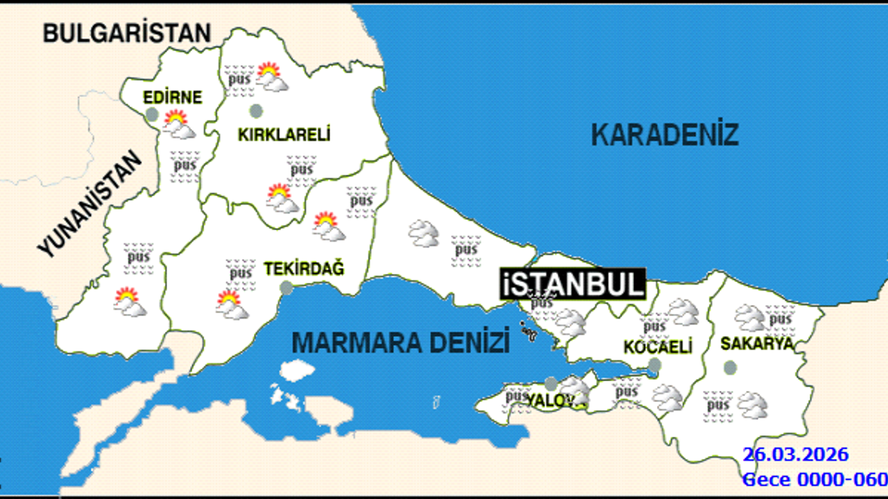 Bugün, 26 Mart Perşembe günü İstanbul genelinde havanın parçalı bulutlu olması bekleniyor. Gün içinde en düşük sıcaklık 7, en yüksek sıcaklık ise 12 derece civarında seyredecek. Gece ve sabah saatlerinde ise yer yer pus ve sis görülebileceği tahmin ediliyor. Rüzgarın doğu ve kuzeydoğu yönlerden hafif, zaman zaman orta kuvvette esmesi öngörülüyor. Hava sıcaklığının mevsim normallerinde seyretmesi bekleniyor.