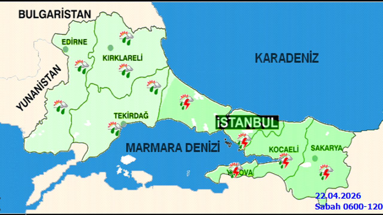 Bugün, 22 Nisan Çarşamba günü İstanbul'da hava parçalı ve çok bulutlu olacak. Gün içinde yer yer kuvvetli sağanak ve gök gürültülü sağanak geçişleri görülecek. En düşük sıcaklık 10°C, en yüksek sıcaklık ise 13°C civarında seyredecek. Hava sıcaklığının yarından itibaren 3 ila 5 derece azalarak mevsim normallerinin altına düşmesi öngörülüyor. Rüzgarın ise kuzey ve kuzeydoğu yönlerden hafif, zaman zaman orta kuvvette esmesi bekleniyor.