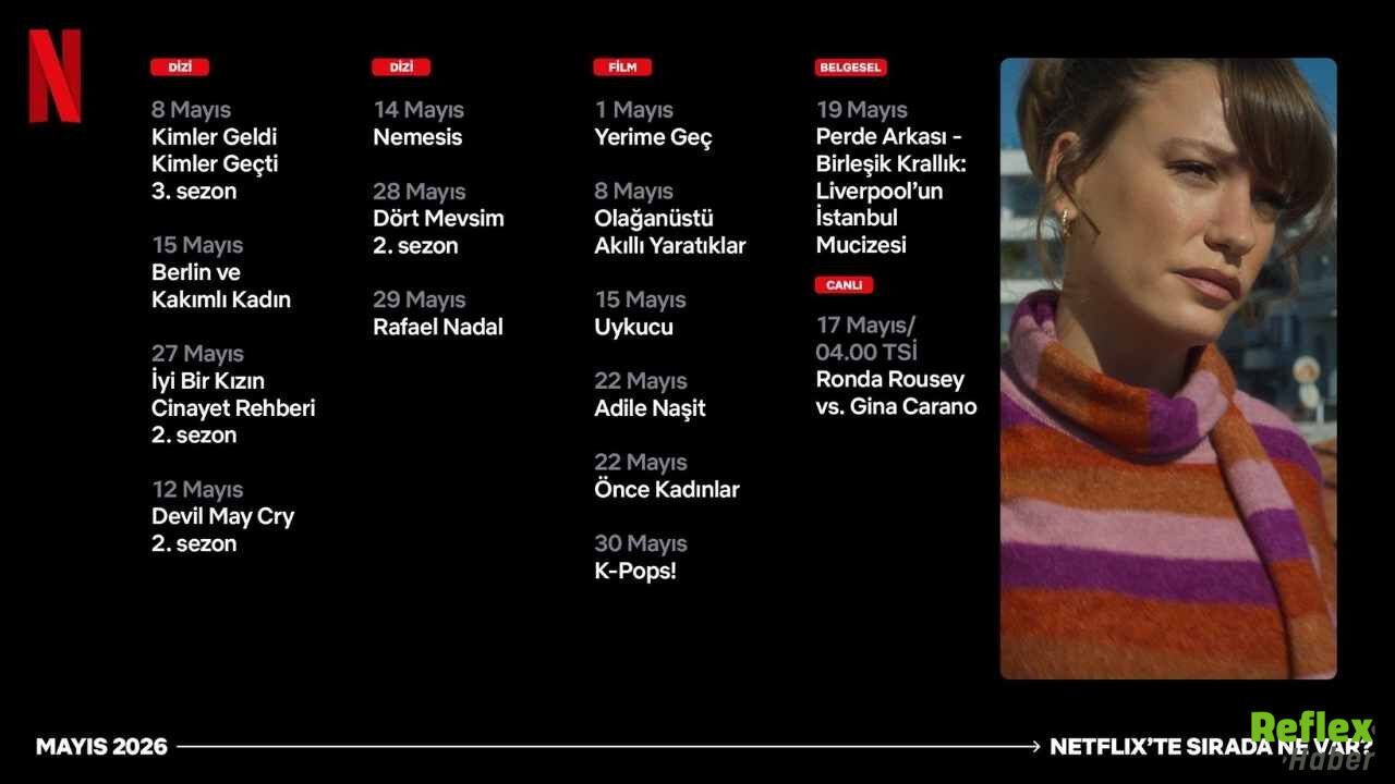 Netflix Türkiye, Mayıs 2026’da platforma eklenecek yeni içerik listesini paylaştı. Açıklanan takvime göre yeni sezon diziler, yerli yapımlar, filmler, belgesel içerikleri ve canlı yayın organizasyonu izleyiciyle buluşacak. Ay boyunca hem uluslararası projeler hem de Türkiye’ye özel yapımlar platformda yer alacak. Yeni sezonları merakla beklenen diziler listede dikkat çekerken, biyografi türündeki yapımlar ve spor içerikleri de öne çıkıyor. Mayıs takvimi, farklı türlerde içerik arayan izleyicilere geniş bir seçenek sunuyor. İşte Netflix Türkiye Mayıs 2026 içerik takvimi.