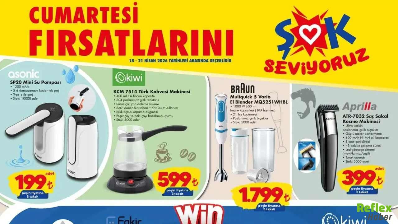 18 Nisan 2026 tarihli ŞOK aktüel kataloğunda elektrikli ürün grubu geniş yer tuttu. Asonic SP20 mini su pompası 199 TL fiyatla listelendi. 1200 mAh batarya kapasitesine sahip ürünün tek şarjla 5 ila 6 damacanaya kadar kullanım sunduğu aktarıldı. Kiwi KCM 7514 Türk kahve makinesi 599 TL’den satışa çıkacak. 6 fincan kapasitesi bulunan cihazın poşet çay ile bitki çayı hazırlama özelliği de yer alıyor. Braun Multiquick 5 Vario el blender seti, MQ5251WHBL modeli ve 21 hız kademesiyle katalogda bulundu. Aprilla ATR-7032 saç sakal kesme makinesi ise 399 TL fiyat etiketiyle duyuruldu.