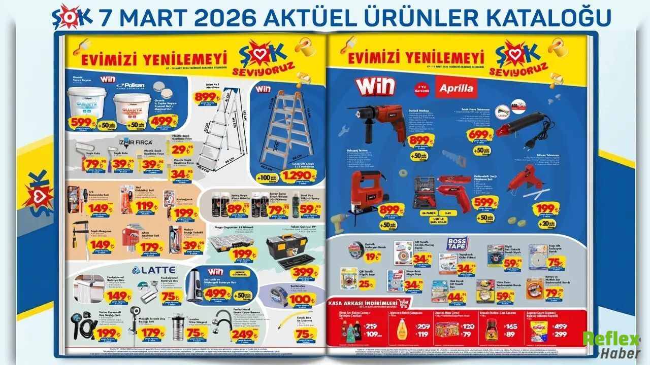 ŞOK Market’in 7 Mart 2026 tarihli aktüel ürünler kataloğu yayımlandı. Hafta sonu raflara gelecek kampanya ürünlerinde özellikle ev yenileme, tamirat malzemeleri, elektrikli el aletleri ve temel ihtiyaç ürünleri dikkat çekiyor. Bahar aylarının yaklaşmasıyla birlikte boya ve tadilat ürünlerinin öne çıktığı katalogda birçok ürün indirimli fiyatlarla satışa sunulacak. Cumartesi günü itibarıyla mağazalarda yerini alacak kampanya ürünleri, uygun fiyatlı alışveriş yapmak isteyen vatandaşlar tarafından yakından takip ediliyor.