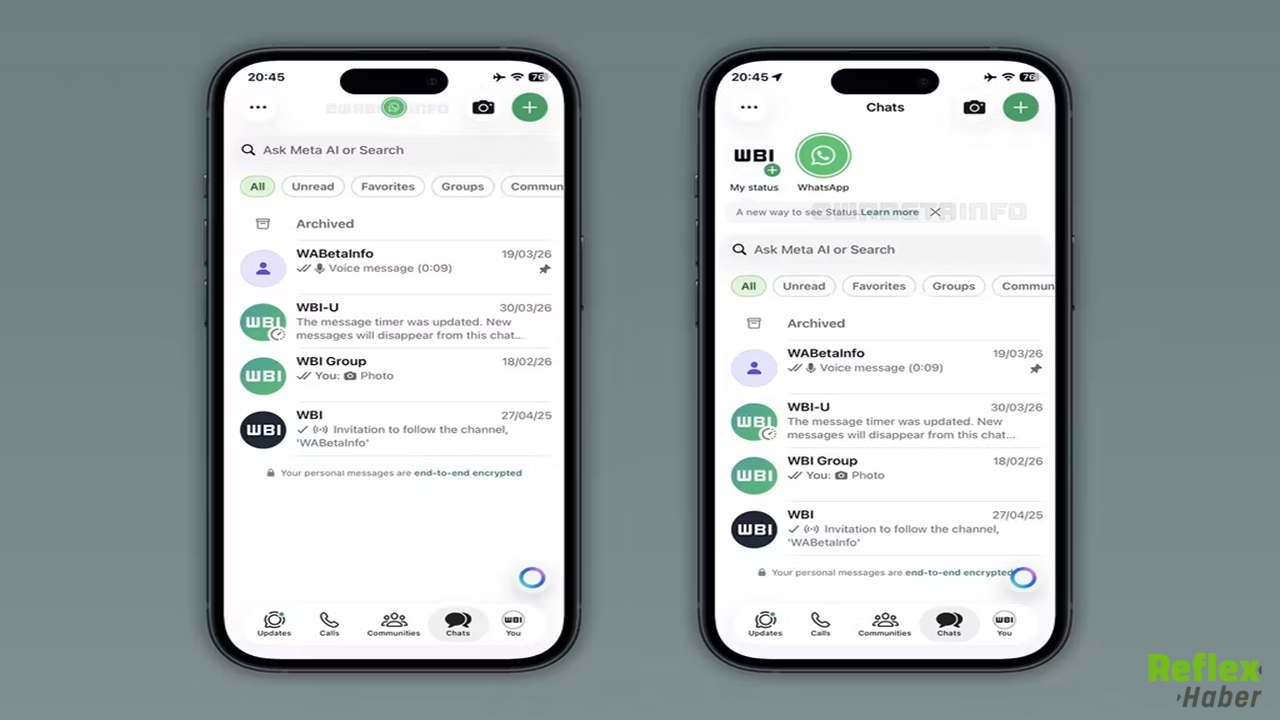 WhatsApp, durum güncellemelerini uygulama içinde daha görünür hale getirecek yeni bir arayüz düzenlemesi üzerinde çalışıyor. iOS için TestFlight üzerinden dağıtılan güncel beta sürümünde ortaya çıkan detaylara göre, durum paylaşımları yakında sohbet sekmesinin üst bölümünde gösterilebilecek. Mevcut yapıda durumlar ayrı bir sekmede yer alırken, yeni düzenleme ile kullanıcıların uygulamayı açar açmaz bu içeriklere daha hızlı ulaşması hedefleniyor. Böylece WhatsApp, durum özelliğini uygulamanın daha merkezi bir noktasına taşımaya hazırlanıyor. Son dönemde hem iOS hem de Android beta sürümlerinde görülen işaretler, platformun bu alanı daha aktif hale getirmek istediğini gösteriyor. Paylaşılan bilgilere göre özellik şu an için kullanıma açılmış değil. Ancak altyapı hazırlıklarının sürdüğü ve yeni tasarımın ilerleyen süreçte daha geniş kullanıcı kitlesine sunulabileceği görülüyor.